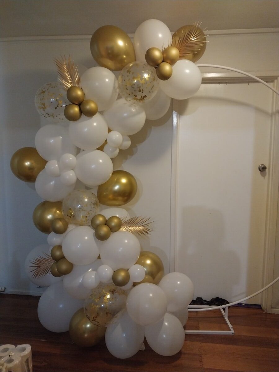3m balloon garland with white, gold, glitters and artificial leaves, it can be designed with any colours and sizes as desire.